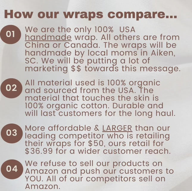 There are several wraps on the market that you can buy but most of them source direcly from china (who even knows what material and chemicals are on them) & Canada then marking the product up to ridiculous prices. There are several things I take very seriously: quality, organic, fair trade, chemical free, not sold on Amazon and made in the USA. I will never budge from these standards.